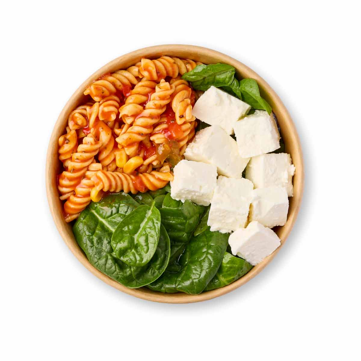 Pasta (76.92%): Herby Tomato Sauce (Water, Sugar, Spirit Vinegar, Rapeseed Oil, Tomato Paste (12%), Thickener (E1422, E415), Salt, Onion, Garlic, Herbs (0.35%) (Parsley, Basil, Mint), Paprika Extract, Preservative (E202), White Pepper), Pasta (35%) (Durum WHEAT (GLUTEN) Semolina), Tomatoes, Mixed Peppers, Onion; Greek feta cubes (19.23%): Feta Cheese (MILK), Salt, Starter Culture, Rennet; Leaf spinach (3.85%): Leaf spinach.